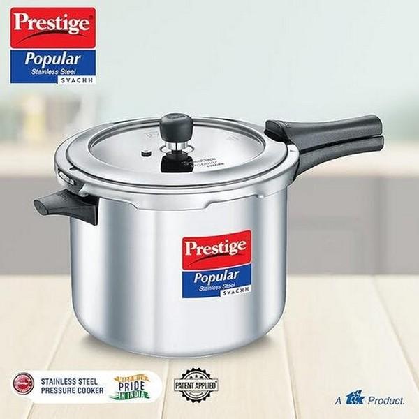 BODY: Prestige Popular is an outer lid pressure cooker made from virgin aluminium which is light in weight and long lasting. The outer lid feature is suitable for both separator cooking and direct vessel cooking.