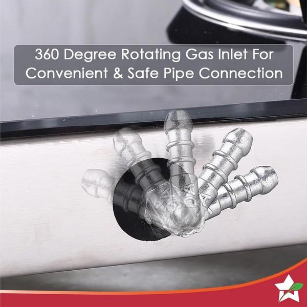 Highly efficient tri-pin brass burners provide uniform heating • Heavy-duty pan support