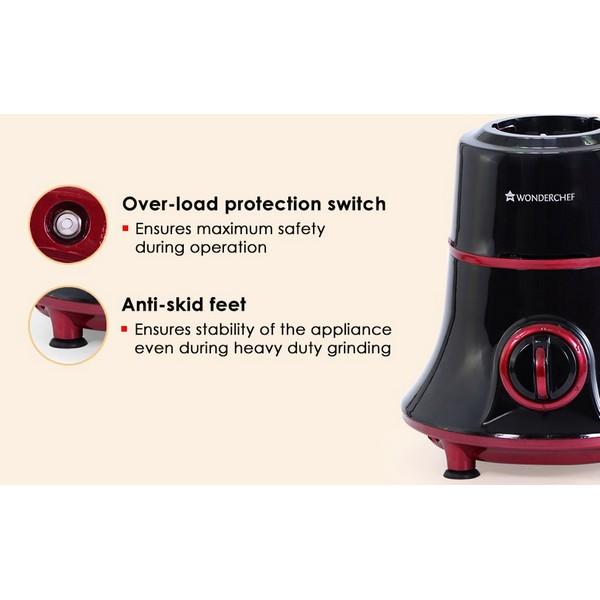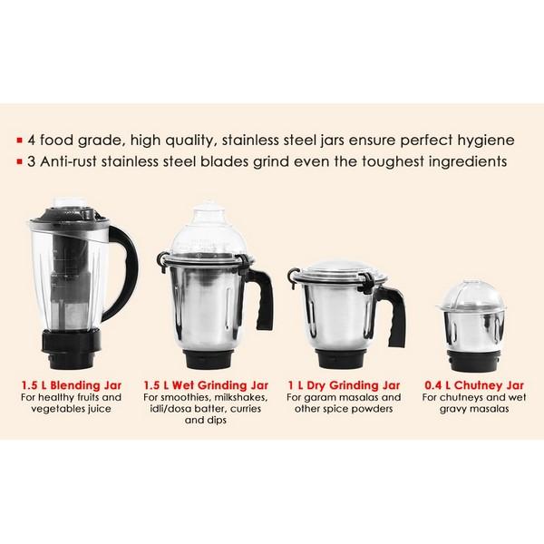 Anti-rust stainless steel blades grind even the toughest of ingredients to make amazing podi, sambhar masala, coconut chutney, garam masala, idli-dosa batter, purée, pastes, milkshakes, smoothies and much more!