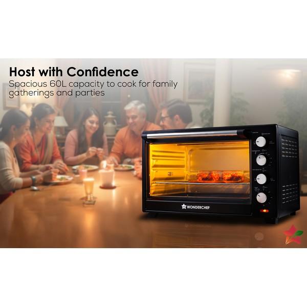 Includes OTG, Chromed wire rack, Baking and grilling tray and tray handle Capacity: 60 litres, Suitable for 4-6 people; Dimensions: 63*44*43 cm Power Consumption: 220-230V~50Hz~2000W; Warranty: 2 years Material: Stainless Steel; Heating Type: Grill + Convection and Control Type: Rotating Knob; Heating element selector: top, bottom, sides Wonderchef products are inspired by Italian Design and adhere to German Quality Standards.