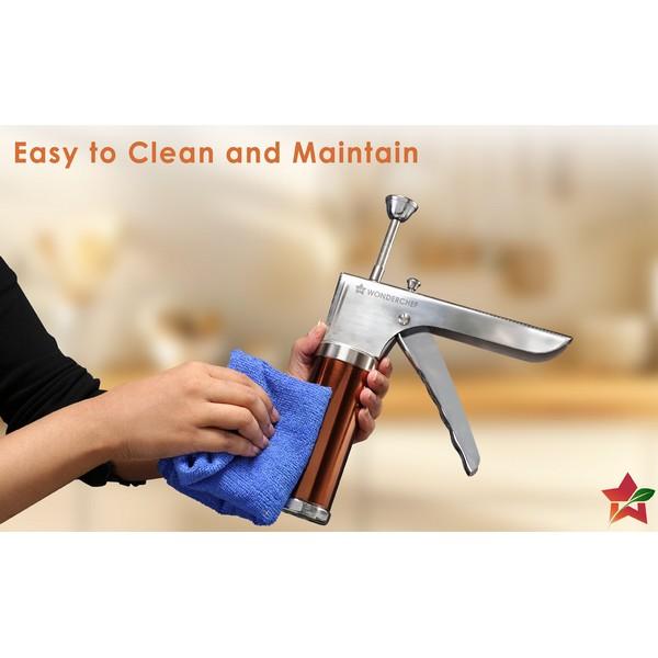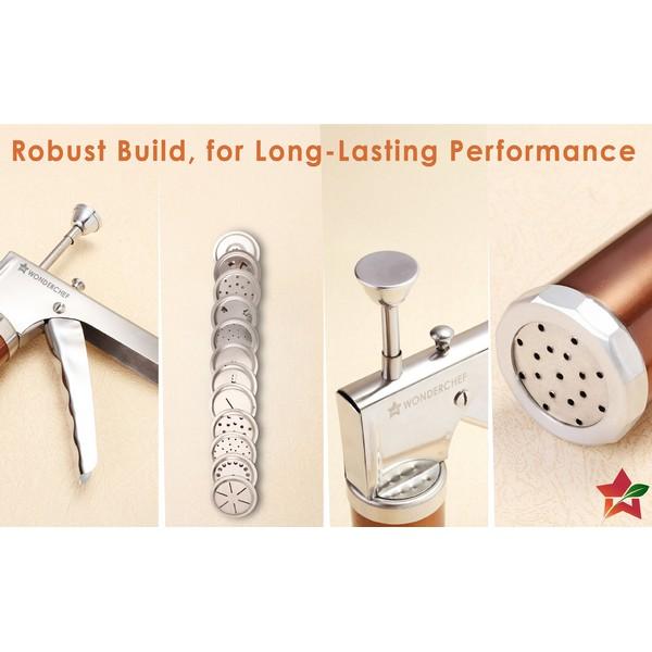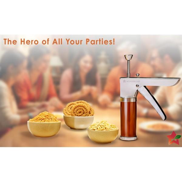 Make healthy snacks at home - chakli, sev, bhujia, papdi, fafda, salli, gathiya and more. Crafted from high-quality stainless steel, this kitchen tool is sturdy and durable. 12 varied shaped plates to make different types of snacks with ease. Easy to use - press lightly to roll out the dough directly into the kadhai.